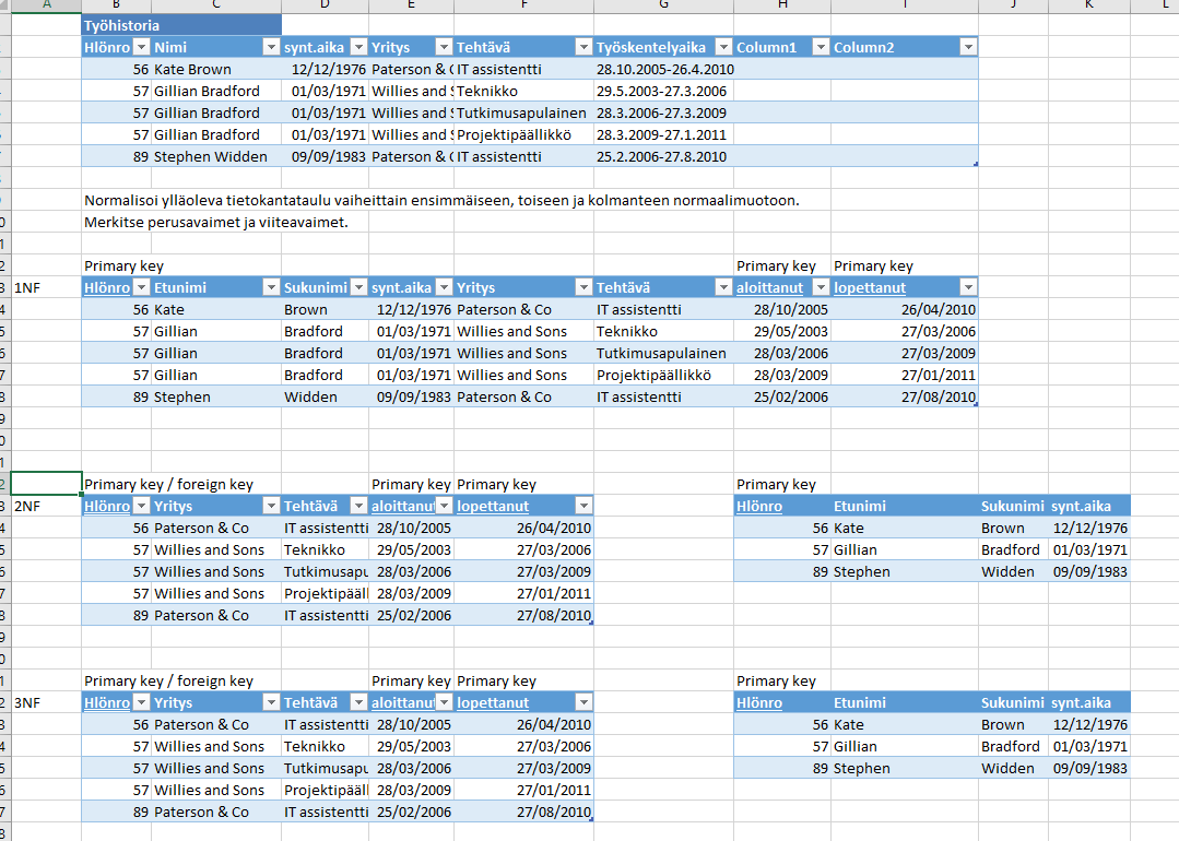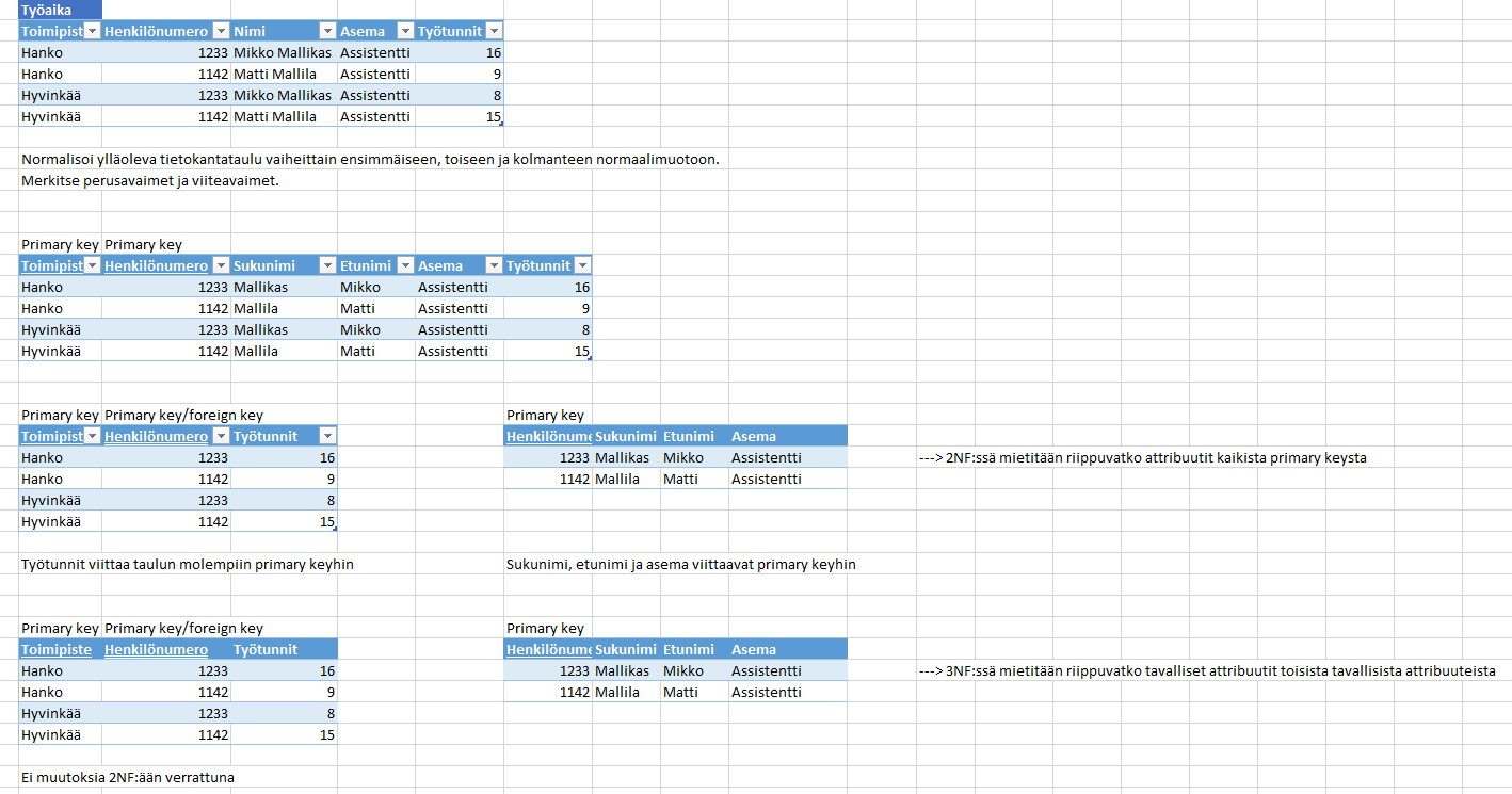 * Jos koostuu listasta asioita (kuten useampi puhelinnumero), täytyy näille tehdä uusi taulu (jossa esim. sarakkeet "henkilötunnus" sekä "puhelinnumero" --> molemmat ovat tällöin myös Primary keyta