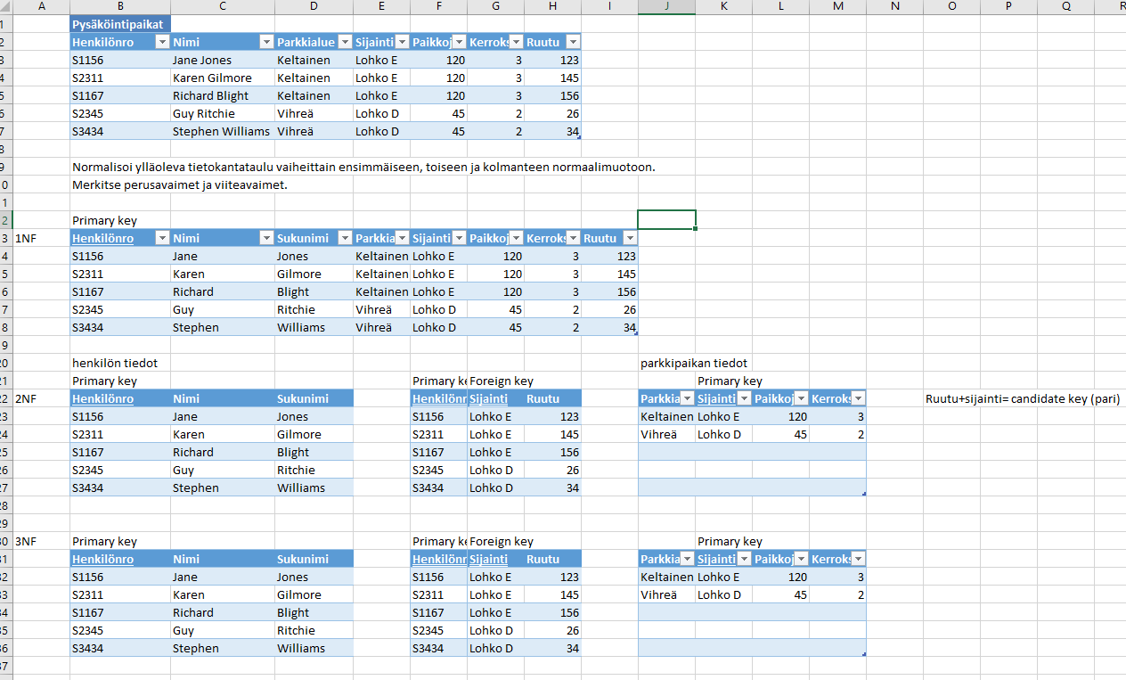 * kun pilkkoo taulut käyttötarkoituksen mukaan, kannattaa asioita ajatella entiteetteinä (ER-mallin mukaan): esim. Henkilöllä on Parkkipaikka Parkkitalossa