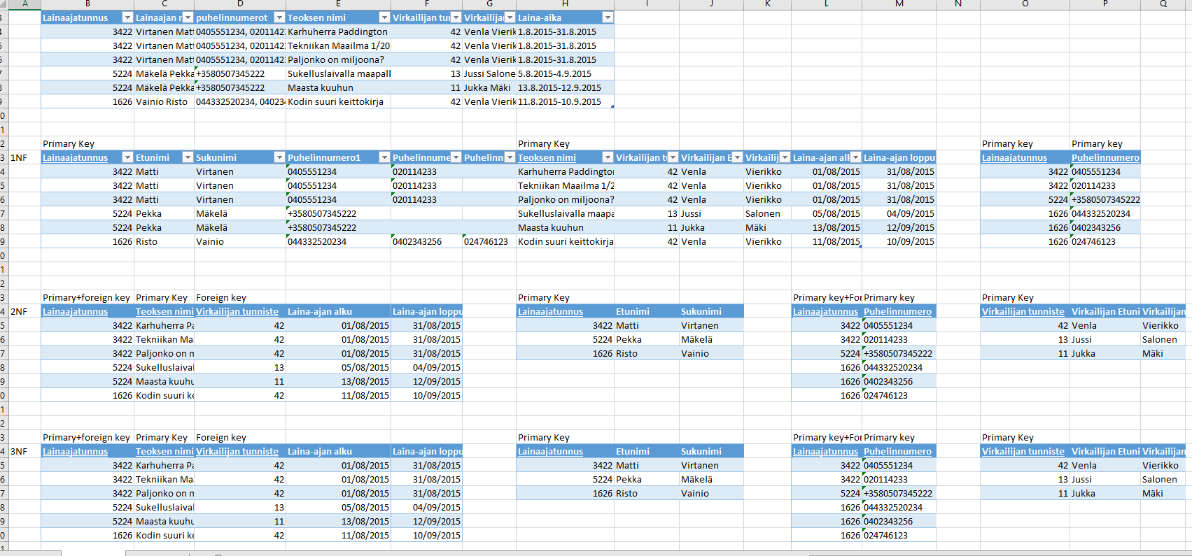 * Jos koostuu listasta asioita (kuten useampi puhelinnumero), täytyy näille tehdä uusi taulu (jossa esim. sarakkeet "henkilötunnus" sekä "puhelinnumero" --> molemmat ovat tällöin myös Primary keyta