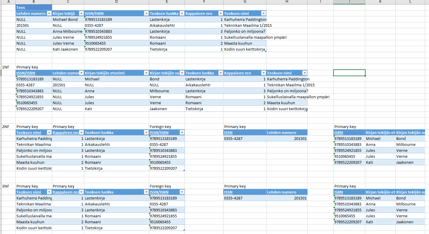 --> jos taulussa on asioita, jotka eivät liity suoranaisesti toisiinsa, ne siirretään omiin tauluihinsa